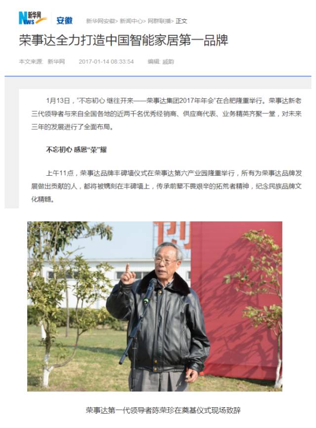1月13日,“不忘初心继往开来——荣事达集团2017年年会”在合肥隆重举行。荣事达新老三代领导人与来自全国各地的近两千名优秀经销商、供应商代表、业务精英齐聚一堂,共商发展大计,对未来三年的发展进行了全面布局。